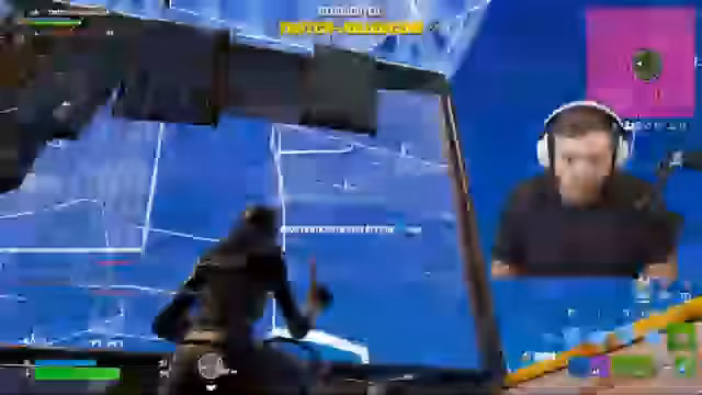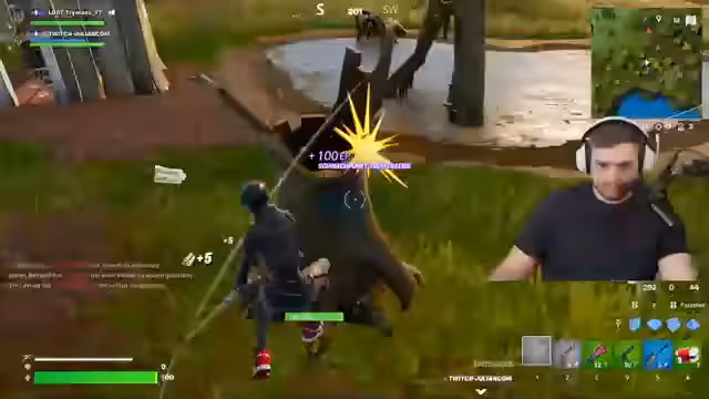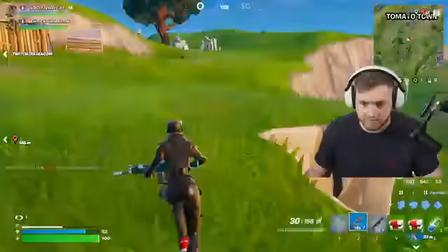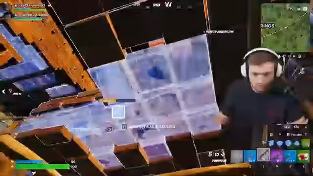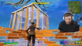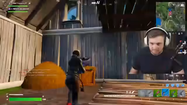 00:07:01Nach dem Landen beginnt das Spiel sofort mit intensiven Kampfhandlungen. Einem Gegner wird beobachtet, wie er eine Wand baut, während der Streamer ihn mit der Minigun beschießt. Die Schüsse passieren die Wand durch und verursachen hohen Schaden, was die Stärke der Waffe demonstriert. Nachdem der Gegner besiegt ist, wird die Leiche lootet und es wird an strategische Positionen und Nachschub für den nächsten Push gedacht.