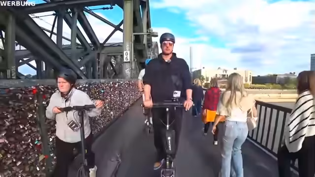 01:43:02Nach dem sportlichen Teil fährt die Gruppe weiter zur Kölner Seilbahn. Auf dem Weg dorthin gibt es eine kleine Show-Einheit, bei der die Streamer versuchen, mit ihren Segways eine Rampe zu befahren und dabei Railing-Ricks zu vollziehen. Der Streamer Max schafft dabei eine spektakuläre Fahrt. Die Gruppe verlässt den Bolzplatz, um zur nächsten Station, der Kölner Seilbahn, zu fahren und den Rhein zu überqueren.