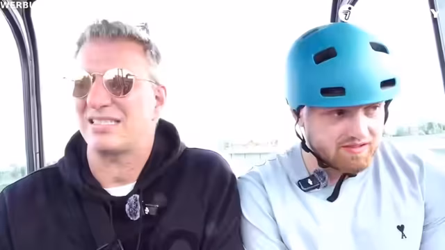 01:59:15Die Gruppe verlässt die Segways, um mit der Seilbahn über den Rhein zu fahren. Es gibt Diskussionen über das Höchstgewicht und die Enge der Gondel. Während der Fahrt in großer Höhe klagen mehrere Teilnehmer, insbesondere Chad, unter starkem Stress und Angst vor der Höhe. Helmverlust und Körperkontakt innerhalb der Gondel sorgen für zusätzliche chaotische Momente.