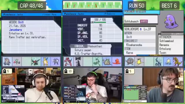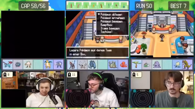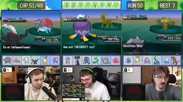 01:44:20Der Stream wechselt zum eigentlichen Hauptinhalt, einem Trio-Soulink-Stream in Pokémon, der als der 50. Versuch bezeichnet wird. Das Ziel des Streams ist es, Orden zu sammeln und Pokémon-Encounters zu meistern. Die Teilnehmer präsentieren ihre Teams, die zum Teil bereits starke Verluste erlitten haben, und bemerken, dass das von einem Streamer genutzte Darkrai aufgrund seiner hohen Anfälligkeit für schnelle K.o.-Treffer suboptimal für dieses Format ist. Die Gruppe muss strategisch entscheiden, welches Pokémon sie als nächstes fangen und in ihr Team aufnehmen wollen, wobei sie sich auf eine öffentlich zugängliche Liste mit verfügbaren Pokémon stützen. Die Atmosphäre ist trotz einiger strategischer Debatten und Verluste sehr enthusiastisch und humorvoll.