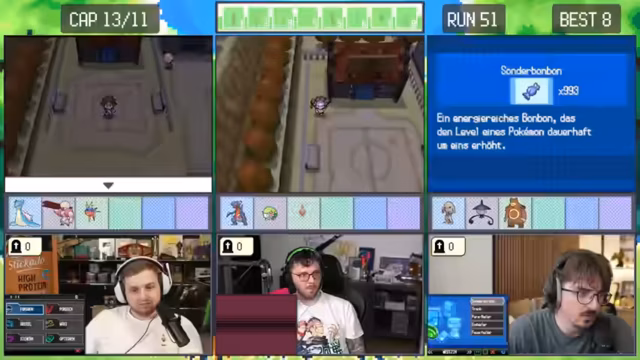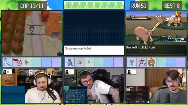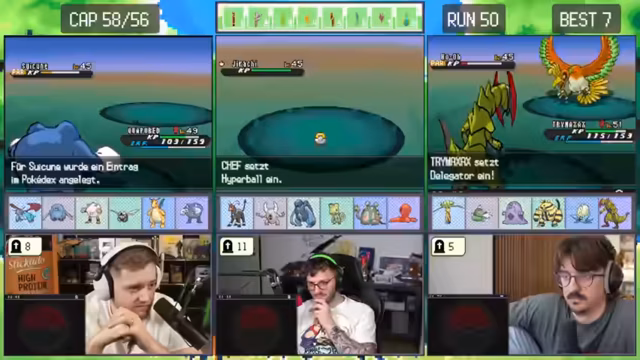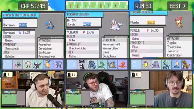 06:15:38Zu Beginn der 52. Runde der Pokémon-Challenge wird die Strategie für das aktuelle Team besprochen. Die Gruppe betrachtet die schwachen Punkte der Pokémon, insbesondere ein Lapras mit minus vier Verteidigung, was als besonders schlechter Zug kritisiert wird. Die Gespräche sind von einem humorvoll-rohen Ton geprägt, in dem die Pokémon mit Spottnamen wie "Arschlochfrisur" bedacht werden, während der Fokus auf der Verbesserung der Teamdynamik und der Vermeidung von Fehlern in den kommenden Kämpfen liegt.