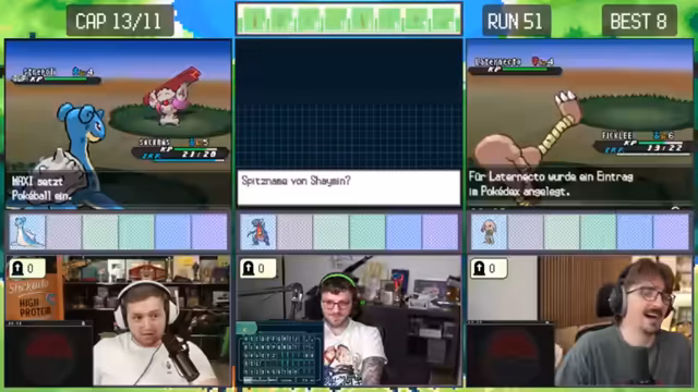 05:12:53Nach einem anscheinend gescheiterten Versuch wird der aktuelle Nuzlocke-Run fortgesetzt. Streamer und Teammitglieder analysieren ihre gesammelten Pokémon, darunter starke wie Romatra, Lapras und Knackly. Dabei werden die aktuellen Regeln und die Stärke des Teams diskutiert, wobei auch die vom Streamer als "ärgerlich" empfundene hohe Fangwahrscheinlichkeit von fast 94 % für ein bestimmtes Pokémon thematisiert wird. Das Ziel ist weiterhin, sich bis in die Top 4 zu kämpfen und als stärkste Trainer zu gelten.