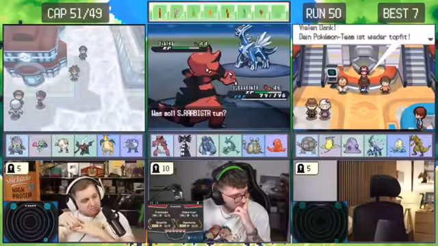 05:31:30Während des laufenden Streams wird über persönliche Themen gesprochen. So erklärt ein Teammitglied seine häufige Abwesenheit durch weltweise Reisen für professionelle "Placements" und erläutert seine tägliche Spielroutine von bis zu 15 Stunden an den Home-Tagen. Auch die Streaming-Technik wird thematisiert, als ein PC-Absturz während eines Krypto-Miner-Vorwurfs die Übertragung kurz unterbricht und eine manuelle Korrektur erforderlich macht. Der Fokus bleibt aber auf dem Pokémon-Spiel.