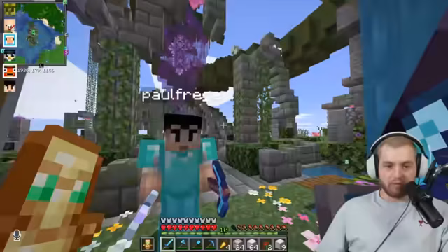 08:11:39Der Fokus verlagert sich zurück in die Overworld. Es werden Diamanten für das Upgraden von Ausrüstung und für das Kopieren von Smaragdblöcken benötigt. Der Streamer baut eine große Farm für Gunpowder, welche mit der Zeit mehr Ebenen erhält. Der Bau einer Ender-Chest ist ebenfalls ein Ziel, um Gegenstände sicher zu transportieren.