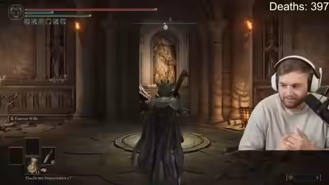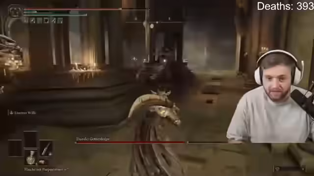03:13:38Der Streamer kündigt an, Elden Ring zu spielen und sich dem Godskin-Duo zu stellen, einem Kampf, vor dem er sich fürchtet. Er aktiviert den Deathcounter und erwartet viele Tode. Der Weg zum Boss wird als nervig beschrieben, da ein Gegner durch die Wand angreift. Der Streamer erklärt seine Taktik, nur den dünnen Gegner anzugreifen, da der Dicke in Phase 2 zu stark ist. Er stirbt oft durch den Charge-Angriff des Dicken und den Propeller-Angriff des Dünnen. Der lange Weg zum Boss frustriert ihn, da es keinen Maritas Pfahl direkt davor gibt. Er kritisiert das Angriffsmuster der Gegner und die hohe RNG (Zufallsfaktor) im Kampf. Der Streamer stirbt immer wieder und verliert Heiltränke. Er überlegt, ob sich der Kampf überhaupt lohnt und diskutiert mit dem Chat über seine Spielweise.