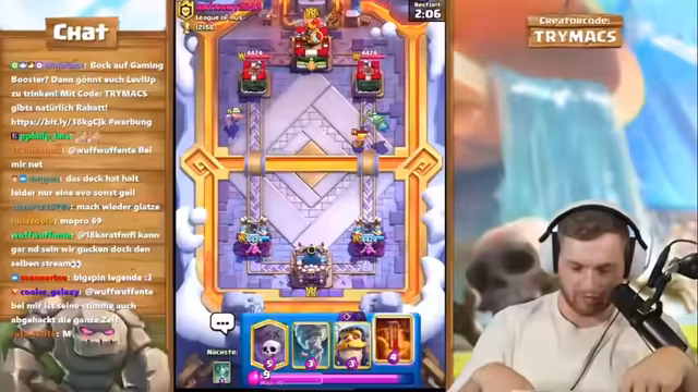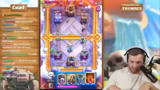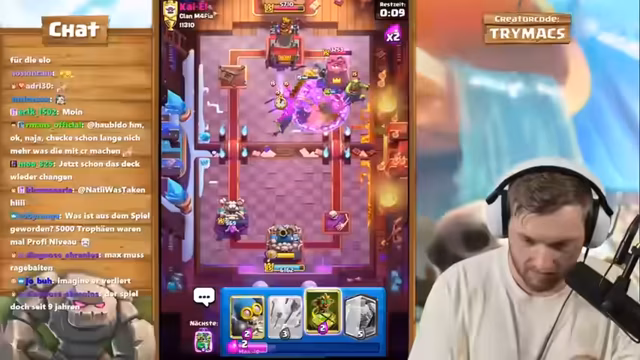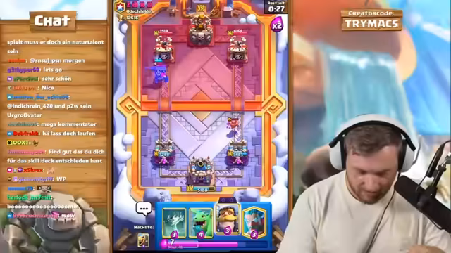 00:41:35Auch wenn das Deck überwiegend funktioniert, treten während der Spiele immer wieder Situationen auf, in denen die gegnerischen Verteidigungen, insbesondere Inferno Dragon oder X-Bogen, eine Bedrohung darstellen. Der Streamer und sein Coach müssen ständig ihre Strategie an die gegnerischen Karten anpassen. Es kommt zu kurzen, hektischen Phasen, in denen es gilt, gegnerische Pushes mit präzise gesetzten Gegenangriffen zu kontern. Diese dynamischen Momente, in denen schnelle Entscheidungen gefällt werden müssen, werden als besonders intensiv und herausfordernd beschrieben, auch wenn sie oft im Sieg enden.