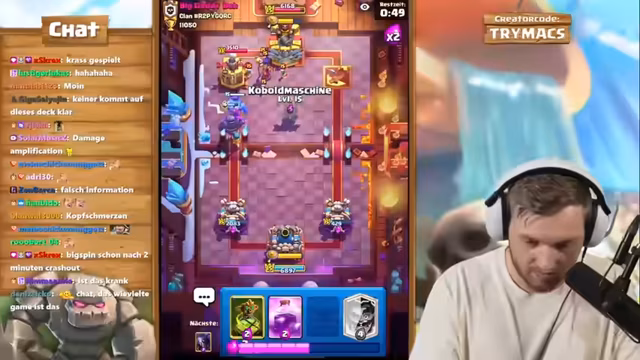 00:45:22Die Session endet mit einer Reihe von Siegen, die den Streamer dicht an sein Ziel von 12.500 Trophäen heranbringen. Trotz des Erfolgs bleibt die Haltung zum gespielten Deck zwiespältig. Einerseits ist es das effektivste Werkzeug für den schnellen Aufstieg, andererseits fühlt sich das Spielen der einfachen Strategie moralisch verwerflich und spielerisch unbefriedigend an. Der Fokus liegt weiterhin darauf, mit dem Goblin Giant Deck weiter zu spielen, solange es funktioniert, den schnellen Fortschritt zu sichern und sich erst dann wieder anspruchsvolleren Decks zuzuwenden.