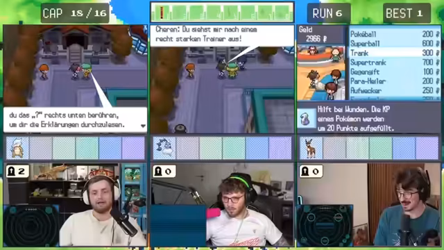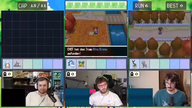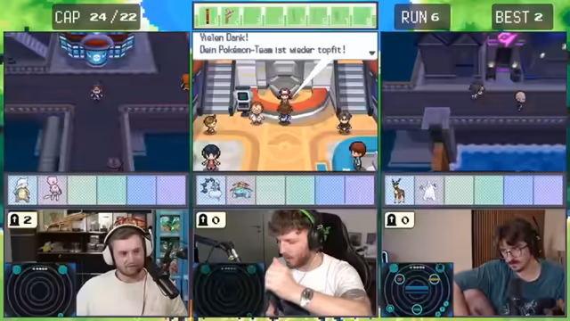 06:14:43Ein zentrales Ereignis ist das Fangen von Mew, der ersten legendären Pokémon des Runs. Nachdem der Streamer einen Meisterball gefunden hat, spürt er Mew in einer Arena auf. Der Fang ist ein heißes Thema, und nach anfänglicher Unsicherheit über die Fangrate und den Gebrauch von Attacken wie 'Kopfnuss' gelingt es ihm, Mew mit einem Meisterball zu fangen. Anschließend beginnt ein äußerst knapper Kampf gegen den Arenaleiter, bei dem das Team knapp mit 2 HP überlebt.