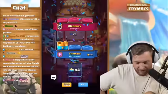 02:34:04Trotz der Fehler wird das Spiel gewonnen und ein neuer All-Time-Trophäenrekord von 12.000 erreicht. Der Streamer hebt die Stabilität des No-Damage-Decks hervor, das eine sichere Basis bietet. Es wird darüber diskutiert, dass das Deck seit sieben Jahren existiert und er einer der wenigen Spieler weltweit ist, es auf diesem Level zu spielen. Die Stimmung ist geprägt von Erleichterung und der Freude über den persönlichen Erfolg.