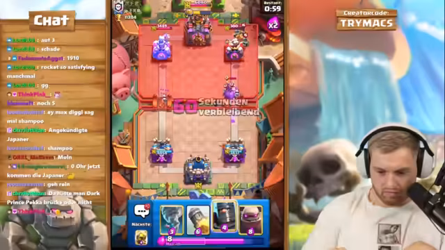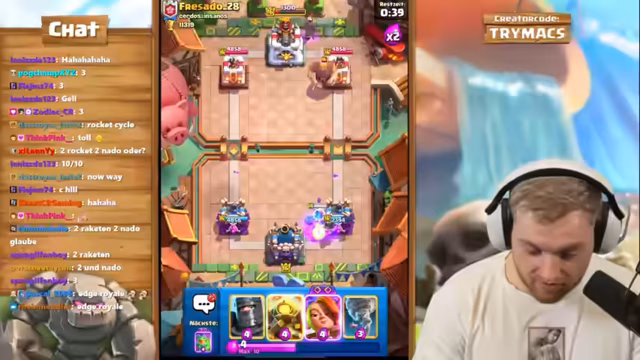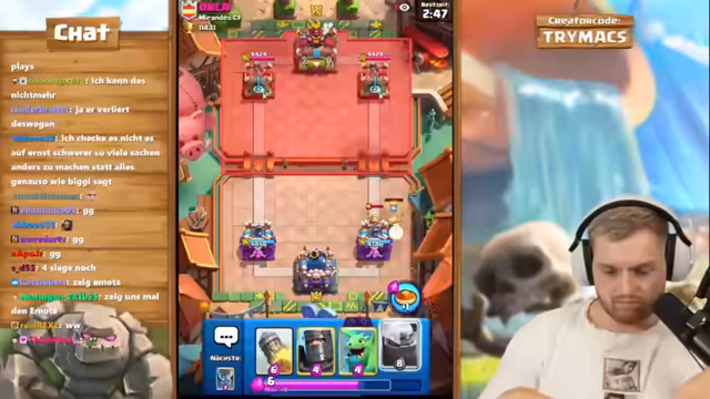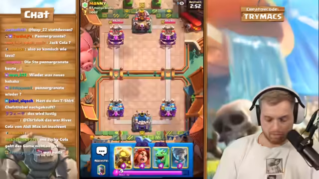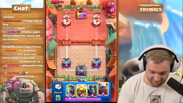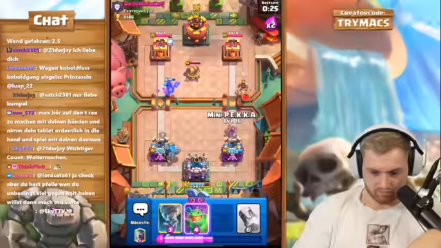 04:00:41Der Stream konzentriert sich auf ein intensives Clash Royale-Spiel, wobei der Kommentator den Spielern detaillierte Anweisungen gibt. Es geht darum, den Mortar des Gegners mit einer strategischen Kombination aus Golden Defensive, Minipacker und Baby Dragon zu kontern. Der Fokus liegt auf präzisen Platzierungen und Zyklen, um den Druck aufrechtzuerhalten, während der Gegner ein OP-Minenwerfer-Deck spielt, das als sehr anspruchsvoll gilt.