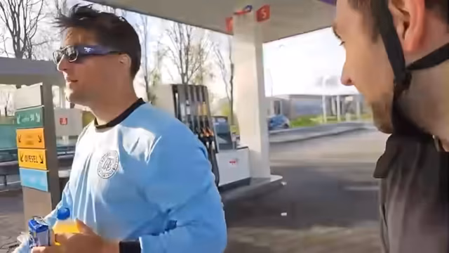 04:11:34Es wird ein Problem mit dem Lenker behoben, der sich immer wieder nach vorne knickt. Es wird vermutet, dass dies an der Stärke oder dem Gewicht des Fahrers liegt. Es wird überlegt, holländische KitKat zu probieren. Es wird über den Umgang mit Pfandflaschenautomaten in Holland gesprochen, die Flaschen oft wieder ausspucken. Es wird zur Tour zurückgeschaltet und festgestellt, dass es anstrengender ist als gedacht. Es wird über Schmerzen in Beinen und Füßen geklagt, aber auch erwähnt, dass es irgendwann nicht mehr schlimmer wird. Es wird über die Möglichkeit gesprochen, an einem Tag 100 Kilometer zu fahren, was als brutal eingeschätzt wird.