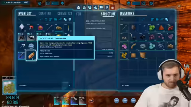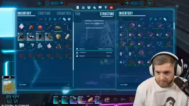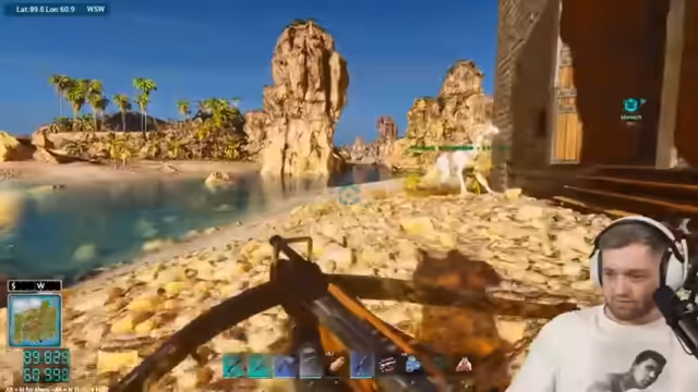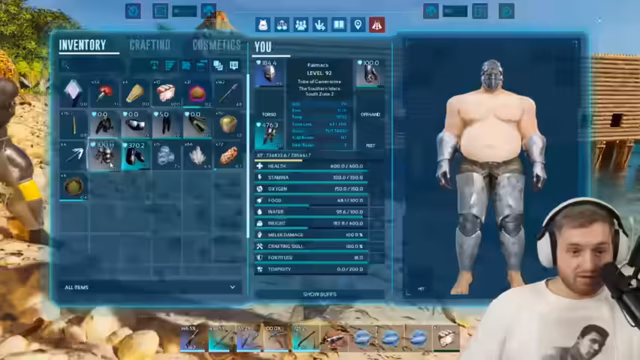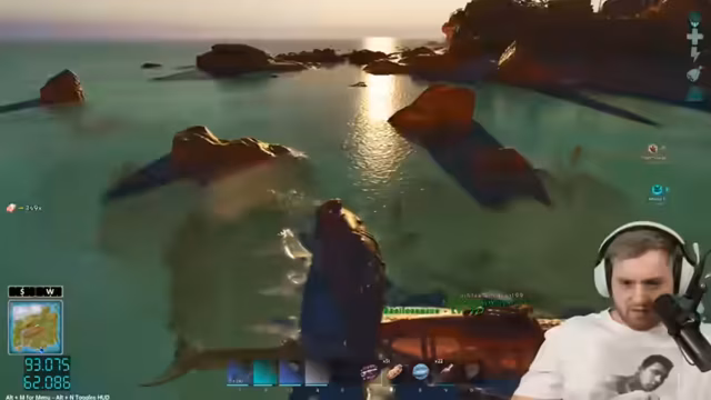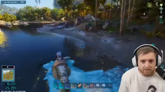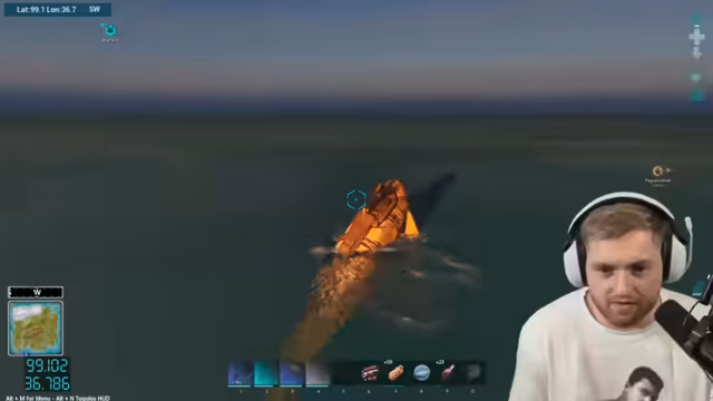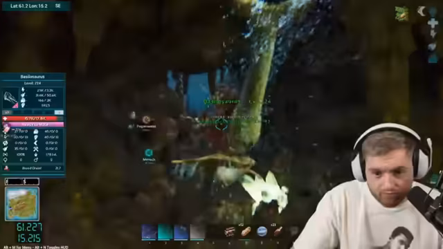 01:39:03Das Herstellen der Flossen gestaltet sich schwierig, da der Streamer Probleme mit dem Crafting hat und sich fragt, wo er die Flossen bauen kann. Später gelingt es ihm, ein komplettes Tauch-Outfit zu craften, doch er wird von Mantas attackiert, während er versucht, zwei Basilos zu tamen. Ein Basilo hat 9.400 Leben, und nach Kämpfen gegen Manta und Quallen, die ihn betäuben, gelingt das Taming eines Basilosaurus mit 15.000 Leben.