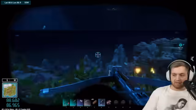 01:36:46Für eine Mission zur Pflanzenfresserinsel wird eine Armbrust mit Pfeilen benötigt, um unter Wasser schießen zu können. Im Ausrüstungsschrank werden überlegene Armbrüste gesucht, und obwohl keine Pfeile im Inventar sind, wird ein Munitionsschrank mit 500 Pfeilen erwähnt. Der Streamer packt 160 Pfeile ein und bespricht die Notwendigkeit von Taucherflaschen und Flossen, die er schnell am Fabricator herstellen will, nachdem er Baupläne gelernt hat.