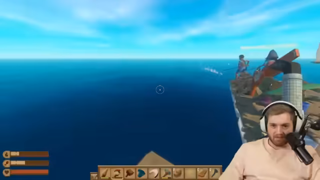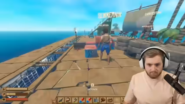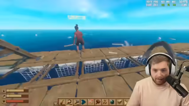 00:01:26Das Team betritt das Spiel und ist anfänglich auf einem kleinen Floß gestrandet. Die ersten Minuten sind von chaotischem Holzsammeln und dem Versprechen, das Floß zu vergrößern, geprägt. Rasch wird deutlich, dass die grundlegendsten Ressourcen wie Holz und Seile fehlen, was zu erheblichem Stress führt. Das zentrale Problem ist der permanente Angriff eines Haien, der alle Versuche, das Floß zu erweitern, gefährdet und zu Todesfällen im Team führt.
