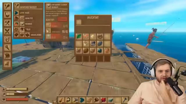 00:19:28Im weiteren Verlauf des Streams etabliert das Team ein funktionierendes System mit mehreren Grills, Trinkstationen und Lagermöglichkeiten. Aufgaben wie das Angeln, das Grillen von Fischen und das Nachfüllen der Wasserstationen werden verteilt, um die Logistik zu optimieren. Auch das Floß wird systematisch ausgebaut und mit einem Segel ausgestattet, was die Reisegeschwindigkeit deutlich erhöht und das Spiel effizienter macht.