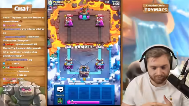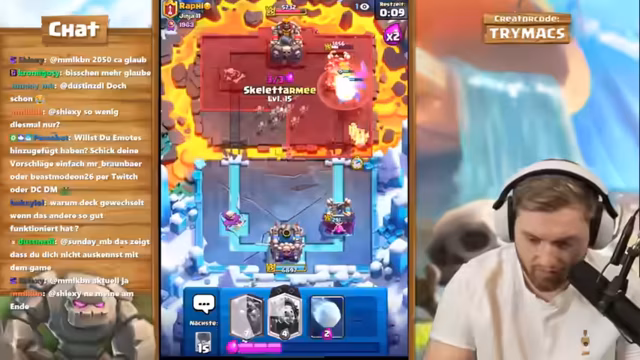 01:22:03Der Stream beginnt mit der Diskussion über ein Inferno-Gebäude und die Anordnung von Minions und E-Spirit, um den Gegner zu stoppen. Nach anfänglichem Zögern wird Lava Hound als erster Zug beschlossen. Es wird das schwierige Matchup gegen den Royal Giant analysiert, bei dem fehlende Abwehrkarten wie Nado oder Freeze als problematisch angesehen werden. Der Spieler fühlt sich gegen gute Gegner im Grand Challenge-Modus unsicher und kritisiert die aktuelle Meta. Ein negatives Ergebnis von 2-2 wird erreicht, und die Meta wird als 'kacke' beschrieben. Der E-Sparky wird als besonders nervig eingestuft, der zu sofortigen Verlusten führt, wenn er nicht perfekt verteidigt wird.