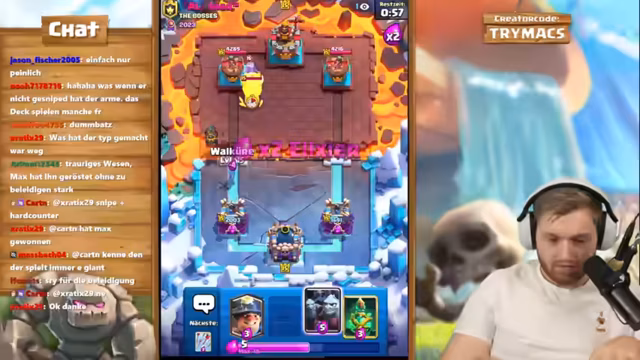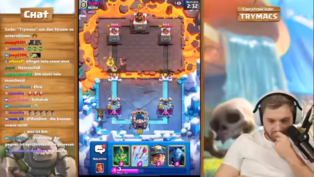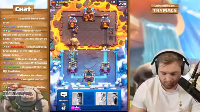 03:08:07Die Strategie konzentriert sich stark auf das Lava Hound Deck. Gegen viele Gegner wird jedoch das frustrierende Matchup von massiven Anti-Luft-Einheiten thematisiert. Der Streamer beschreibt, dass er oft gegen Decks mit Hexe, Pfeile und E-Wizzard spielt, was die Spiele extrem schwierig macht. Diese Gegenmaßnahmen zermürben die Moral und machen es schwer, Spiele zu kontrollieren, auch wenn die Spielstärke hoch ist.