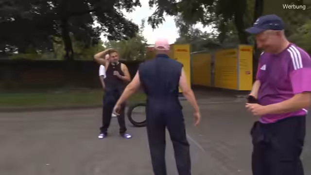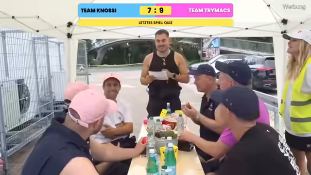 02:52:06Das Team beginnt mit einem sportlichen Wettkampf, bei dem sie mit Reifen auf aus Pizzakartons gebaute Türme werfen müssen, um Punkte zu sammeln. Die Regeln sind klar definiert: je kleiner der Turm, desto mehr Punkte, aber desto schwieriger der Wurf. Das Team hat große Müße, die Türme umzulegen, und erntet dafür den spöttischen Kommentar 'seid ihr schlecht'. Nach vielen vergeblichen Versuchen, die sogar bis zum zehnten Versuch reichen, gelingt es schließlich Niki, einen Turm zu treffen und so den ersten Punkt für sein Team zu erzielen.