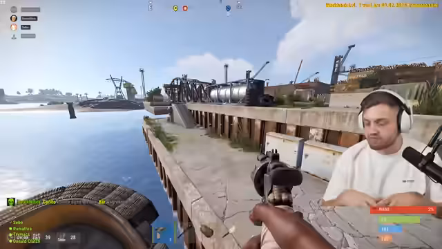 06:10:22Während sie versuchen, mit ihrem Boot an ein anderes anzudocken, werden sie von einem rivalisierenden Tugboat angegriffen. Es kommt zu einem heftigen Schusswechsel, bei dem die Gruppe strategisch überlegen ist. Der Gegner erweist sich als gut ausgerüstet, und der Streamer kritisiert die eigene taktische Schwäche und schlechte Bewaffnung im Vergleich zum Feind.