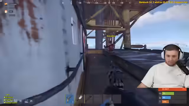 06:00:20Nachdem ein Fußballspiel gegen Blau-Weiß-Ellers gewonnen wurde, wechselt der Streamer zum Spiel Rust. Die Gruppe beschließt, ein Schiff zu scrappen, um Ressourcen zu erbeuten. Sie erkunden das Schiff, stoßen auf Scientists als Mobs, und es wird ein Plan entwickelt, eine Fuzze zu platzieren, um den Zugang zu bestimmten Bereichen zu ermöglichen.
