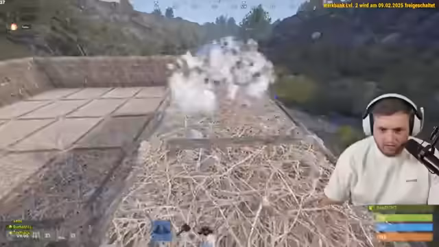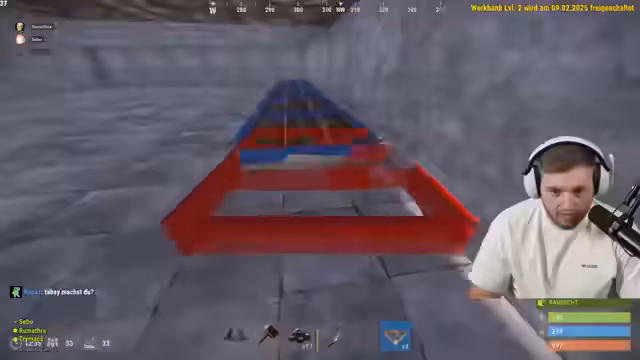00:21:03Trymacs beginnt mit dem Bau seiner Farm-Base und erhält Ratschläge von seinen Teammitgliedern bezüglich der Platzierung des TC (Tool Cupboard), um es vor Angriffen zu schützen. Er vergleicht den TC mit dem Rathaus in Clash of Clans und betont, wie wichtig es ist, ihn zu verteidigen. Er baut eine Tür und ein Code-Lock und fragt, ob er Water Purifier oder Wasserfänger verwenden soll. Er entscheidet sich für die Wasserfänger, da das Wasser in der Nähe Salzwasser ist und die Purifier teuer sind. Er platziert Deckenlampen, um eine angenehme Atmosphäre zu schaffen, und baut einen Türrahmen ein. Er fragt nach der richtigen Richtung für die Tür und entscheidet sich für eine Fluchttür nach außen. Er baut die Decken flach, um später Sprinkler anbringen zu können. Er fragt Romatra, ob er schon alles gecheckt hat, wie dieses automatische Zeug funktioniert. Romatra sagt, er weiß zum Beispiel noch nicht, wie man automatisch craftet. Also, ich weiß, wie du Sachen automatisch irgendwo reinbringst, ich weiß aber nicht, wie du dann... Ich glaube, diesen Craft-Prozess musst du selber starten, genau so, wie du die Furnaces selber anschalten musst. Glaub' ich. Aber das hab' ich, also das hab' ich noch nicht gecheckt, aber sonst hab' ich's schon sehr gut gecheckt, würd' ich sagen, ja.