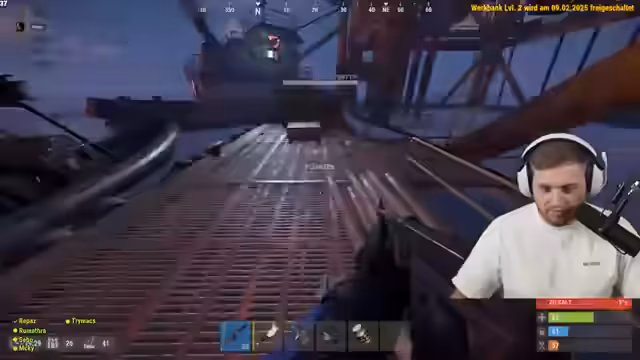 06:11:55Trymacs und sein Team stellen fest, dass andere Spieler ihre Ressourcen genutzt haben, um in seine Strohfarm einzubrechen. Während sie noch darüber diskutieren, werden sie von einem Boot gerammt. Es folgt ein chaotischer Versuch, auf ein Schiff zu gelangen, der jedoch aufgrund von Schwierigkeiten beim Timing und der Navigation scheitert. Trymacs stirbt sogar kurzzeitig und muss gerettet werden. Das Team diskutiert über die Strategie, das Schiff zu entern, und vermeidet dabei Metagaming. Sie beschließen, das Schiff zunächst aus der Ferne zu beschießen, bevor sie versuchen, es zu besteigen. Der Plan erweist sich als schwierig, da die Leitern am Schiff schwer zu erreichen sind und die gegnerischen Spieler sie unter Beschuss nehmen. Mehrere Versuche, auf das Schiff zu gelangen, scheitern, und das Team stellt fest, dass die Leitern zu hoch sind. Sie überlegen alternative Strategien, wie das Anfahren des Schiffes und das Abspringen von ihrem eigenen Boot, um die Leiter zu erreichen.
