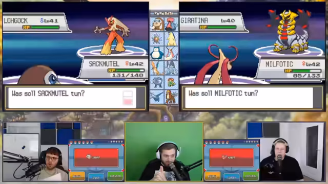 02:23:47Die Streamer diskutieren intensiv über das Einsatz-Pokémon für den Rivalenkampf. Fokus liegt auf der Einsetzung von Milotic, dessen Stärke im Doubles-Modus thematisiert wird. Probleme entstehen durch technische Unstimmigkeiten in der Liste und die Überlegung, ob Milotic überhaupt eingesetzt werden darf. Nach interner Rücksprache und einem erkauften Überlevelungs-Problem bei Chefstrobel wird die endgültige Entscheidung getroffen, auf Milotic zu verzichten und mit vier statt fünf Pokémon in den Kampf zu gehen, da es sich als Feind des eigenen Teams herausstellt.