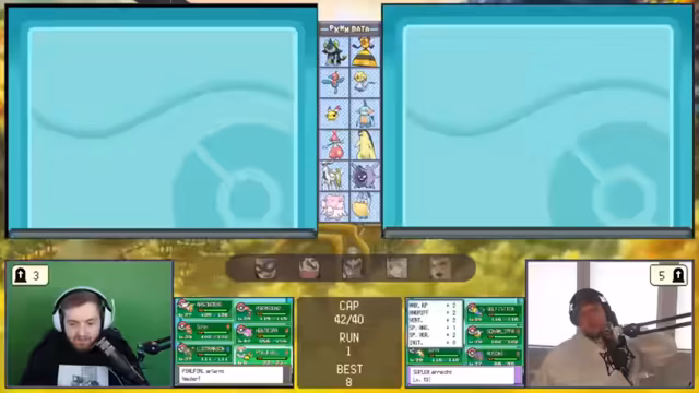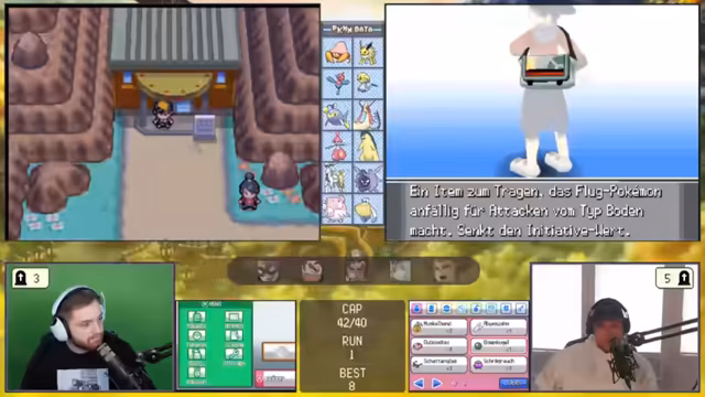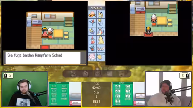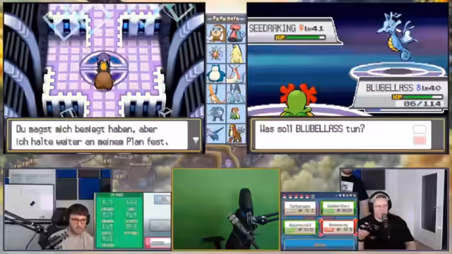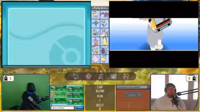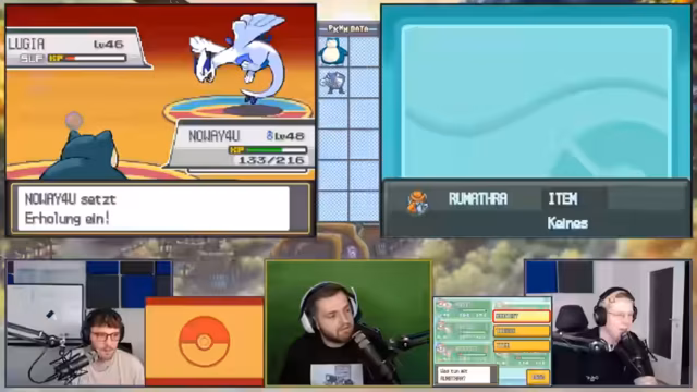 01:29:35Nach dem ersten Kampf bereiten sich die Spieler auf die Durchquerung der Siegesstraße vor, die als extrem schwierig gilt. Zarbexs größtes Problem ist sein Pokémon Milotic, das durch die Kämpfe über Level 42 steigen und für die anschließende Liga unspielbar würde. Er muss daher eine drastische Entscheidung treffen: Milotic durch ein schwächeres Pokémon wie Sumpex ersetzen, obwohl dies das Risiko einer Niederlage in der Top 4 erhöht. Die Suche nach einem passenden Drachen-Abwehr-Pokémon beginnt, während gleichzeitig Zeitdruck entsteht und Diskussionen über Regeln wie die Verwendung von Heiltränken im Kampf geführt werden.