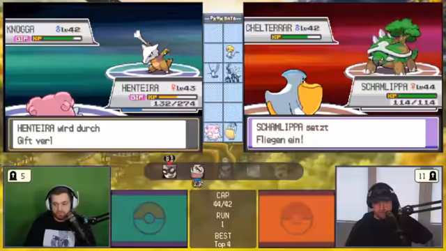 03:55:44Der Kampf gegen das gegnerische Giratina neigt sich dem Ende zu. Trymacs' Pokémon haben nur noch geringe HP, während der Gegner mit einer Top-Genesung eine heilende Attacke einsetzt, was die Situation verzögert. Chefstrobel hat 1 HP, was eine dramatische Spannung erzeugt. Ein Schlüsselmoment tritt ein, als Chefstrobel mit Agilität auf Bluebella wechselt. Obwohl es zu spät scheint, wird das gegnerische Pokémon durch Toxin eliminiert und der Kampf gegen den ersten Trainer gewonnen. Die Diskussion über die Fairness des Spiels und den offen stehenden Chat mit Lösungen überschattet jedoch den Sieg.