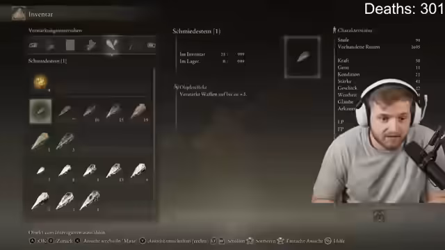 06:29:16Trymacs levelt sein Malbeil auf und experimentiert mit dem neuen Moveset, einschließlich eines ungewöhnlichen seitlichen Angriffs. Er kauft Schmiedesteine, um die Waffe zu verbessern, und stellt fest, dass er zwölf Steine benötigt. Er erkennt, dass seine Laufanimation aufgrund seines Gewichts verlangsamt ist. Er skillt um, um die Waffe zu leveln und seine Ausrüstung zu optimieren. Er levelt die Waffe auf +19 und verkauft Runen, um Kohle zu bekommen. Er verkauft Geistertalilien und andere Items, um seine Finanzen aufzubessern. Er tauscht sich mit Zuschauern über die beste Vorgehensweise aus und erhält Tipps, welche Items er verkaufen kann, um mehr Runen zu erhalten. Er verbessert seine Waffe weiter und erreicht schließlich das Level +15, wobei er feststellt, dass ihm die Runen ausgehen. Er erhält den Rat, die Schildkröte zu holen, um schnell an Runen zu kommen.
