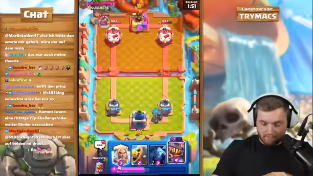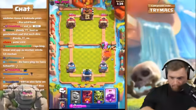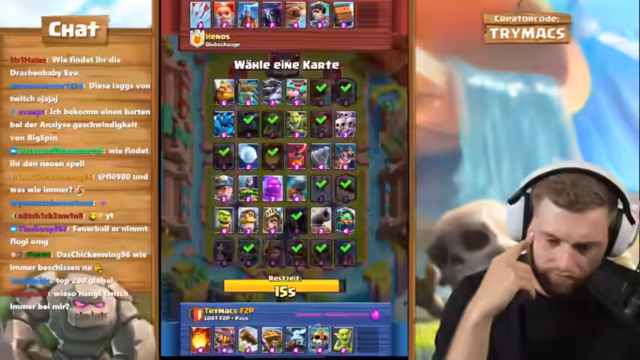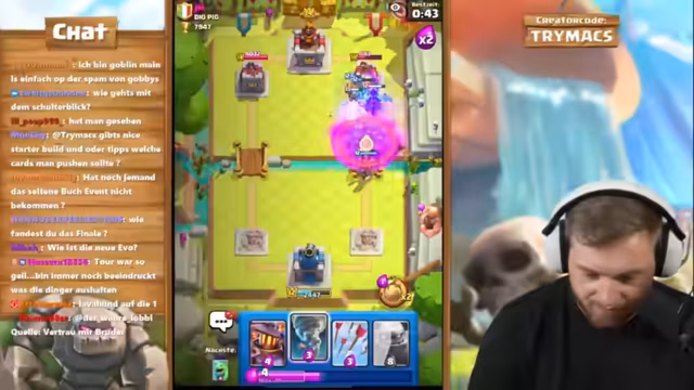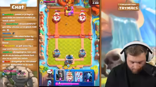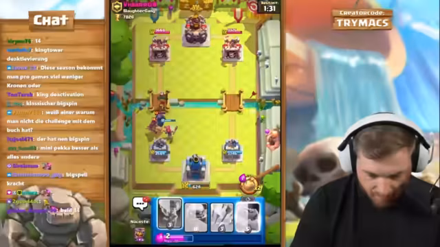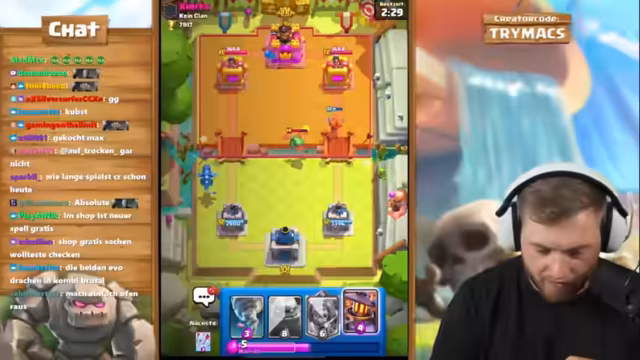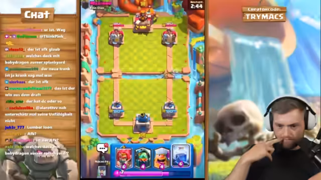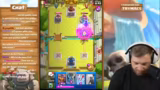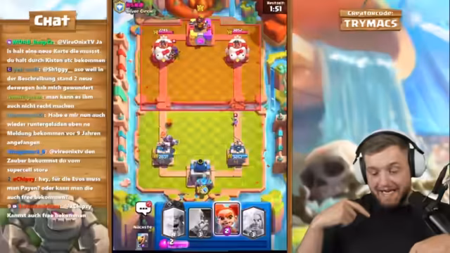 02:14:34Nachdem die Reaktion auf die Videos beendet ist, wechselt der Streamer zum Spiel Clash Royale. Eine neue Season ist gestartet, die zwei neue Karten und den Diamond Pass-Pfad einführt. Der Streamer stellt den 'Evo Baby Dragon' und den neuen 'Wurzelzauber'-Zauber vor. Er aktiviert selbst den Diamond Pass, um Boni wie 'Joker'-Karten zu erhalten, und nutzt den Creator Code 'Trimax', um seiner Community etwas zurückzugeben. Er äußert Begeisterung über die neuen Karten und die damit verbundenen strategischen Möglichkeiten für sein bevorzugtes 'Golem'-Deck.