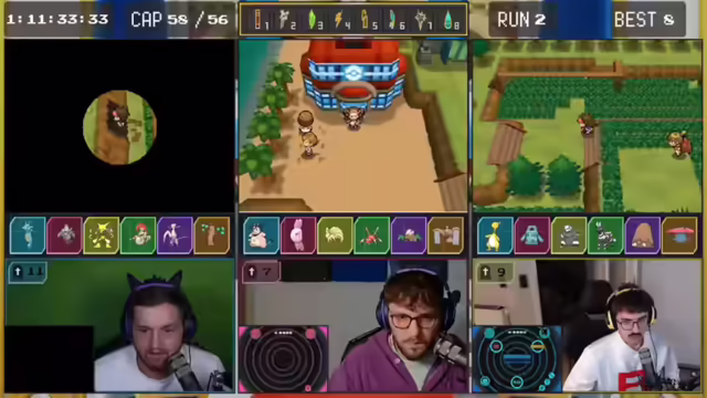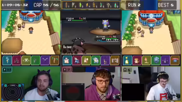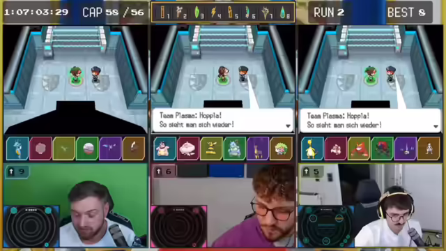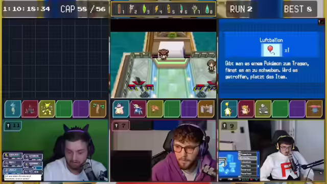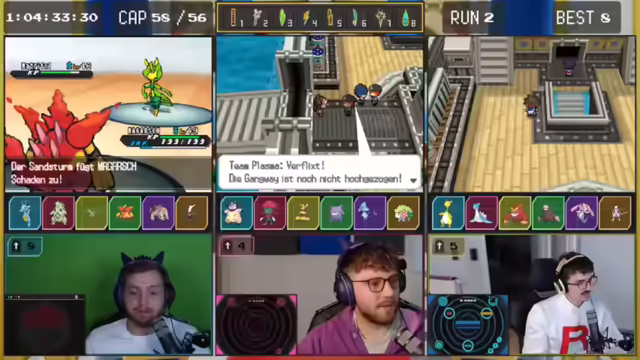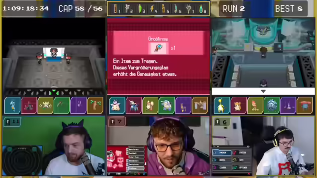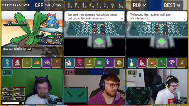 09:51:47Die Gruppe navigiert durch ein verwirrendes Labyrinth mit zahlreichen Teleportern und Betten, wobei sie ständig gegen Trainer kämpfen oder ihnen ausweichen müssen. Die Navigation erweist sich als schwierig, da sie sich die korrekten Teleport-Routen merken müssen, um voranzukommen. Es werden Schalter gefunden und aktiviert, um den Weg freizumachen, wobei einige leichter zu erreichen sind als andere. Ein Schalter ist schwer zu erreichen. Während der Erkundung werden Items wie eine TM für Erdbeben gesucht. Es stellt sich heraus, dass die Gruppe sich die Teleporterwege merken muss. Es werden auch Kämpfe bestritten, wobei Regentanz eingesetzt wird, um die Geschwindigkeit zu erhöhen. Pelipper, ein Pokémon mit der Fähigkeit Regenguss, heilt sich im Regen. Verschiedene Teleporter werden genutzt, um das Labyrinth zu durchqueren, wobei einige Räume bereits erkundet wurden und andere noch unbekannt sind. Die Gruppe tauscht Informationen über die Standorte der Schalter aus, um sich gegenseitig zu helfen. Es werden auch Pokémon wie Victini und Sonnflora bekämpft, wobei Strategien wie der Einsatz von Psycho-Attacken angewendet werden. Die Gruppe findet weitere Schalter und Teleporter, wobei sie sich gegenseitig Anweisungen geben, um den richtigen Weg zu finden. Nach einiger Zeit gelingt es der Gruppe, alle Schalter zu finden und sich aus dem Labyrinth zu befreien.