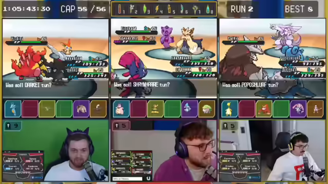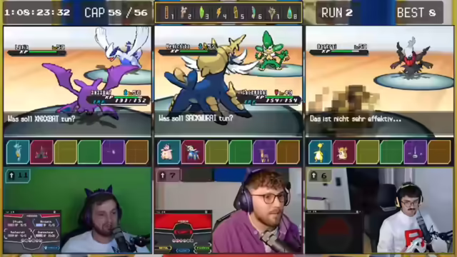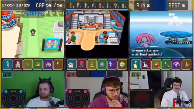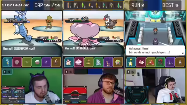 16:40:55Die Gruppe diskutiert die beste Strategie gegen das letzte Pokémon des Gegners, wobei der Einsatz von Seedraking und Simsala in Betracht gezogen wird. Es wird entschieden, mit Seedraking zu beginnen, um den Gegner unter Druck zu setzen. Ein Volltreffer gegen Miloetta wird erzielt, was als großer Erfolg gefeiert wird, da es bereits das vierte Mal im Late Game besiegt wurde. Die Gruppe reflektiert über die Stärken und Schwächen verschiedener Attacken und Pokémon-Typen, einschließlich Kampf, Psycho und Luft. Es wird kurz überlegt, einen Arzt aufzusuchen, um die Pokémon zu heilen, aber letztendlich wird beschlossen, auf Nummer sicher zu gehen und den Weg zurückzugehen, um keine Trainer zu übersehen. Die Gruppe überlegt, wo sie als nächstes hingehen muss und wie sie unnötige Kämpfe vermeiden kann, um den Run nicht zu gefährden. Es wird die Frage aufgeworfen, ob Rob Raphil ein starker Tank ist, was verneint wird. Der EP-Teiler wird geholt, um die Pokémon effektiver zu trainieren. Zwelfels wird als Fake-Tank bezeichnet, der zwar fett aussieht, aber nicht die entsprechenden KP hat. Abschließend wird festgestellt, dass Miluetta eine hohe Spezialverteidigung, aber einen schlechten physischen Death hat, was aber durch einen Crit-Surfer kompensiert wurde.