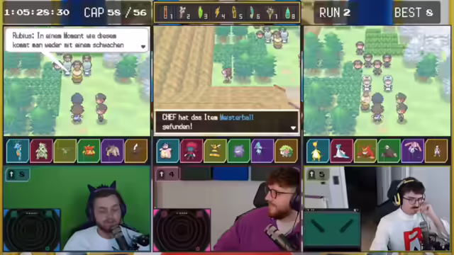 16:44:48Es wird die Häufigkeit kritisiert, mit der bestimmte Wege im Spiel zurückgelegt werden müssen, was als schlechtes Design empfunden wird. Trotzdem wird das grundsätzliche Leveldesign gelobt. Ein plötzlicher "Scheißhaufen" vor dem Ausgang sorgt für Verwirrung, gefolgt von einem Kampf gegen ein Roserat auf hohem Level, aus dem aber erfolgreich geflohen werden kann. Es wird ein Vergleich zu einer Margarita gezogen, die mit Jalapenos "zugeschissen" wurde, was zu Unbehagen führte. Die Gruppe diskutiert den bevorstehenden Hardcore-Fight und den Weg dorthin, wobei sie sich fragt, ob bestimmte Höhlen neue Begegnungen bergen. Topschutz wird aktiviert, um unerwartete Pokémon-Begegnungen zu vermeiden. Es wird die Befürchtung geäußert, dass nach dem aktuellen Kampf noch ein weiterer, noch schwierigerer Kampf gegen ein verschmolzenes Kyurem bevorsteht, was die Wahrscheinlichkeit eines Scheiterns auf 70% erhöht. Die Gruppe bereitet sich auf den Kampf gegen die Riesen-Krotte vor, die mit Swain verglichen wird. Es wird festgestellt, dass die Krotte eine Swain-Ult einsetzt und Raben verwendet, die Leben abziehen. Ein Angriff aus dem ersten Teil des Spiels wird erkannt, und die Figur N wird als "Goat" bezeichnet.