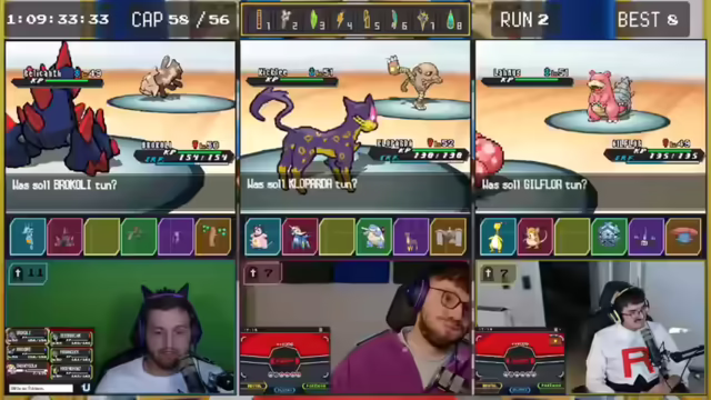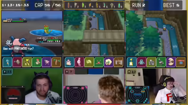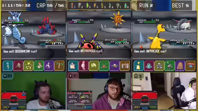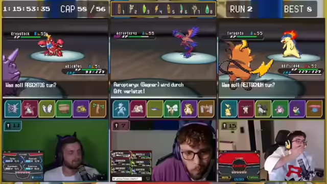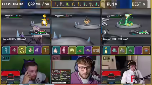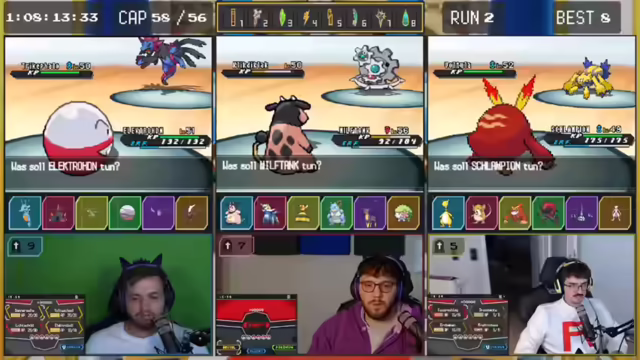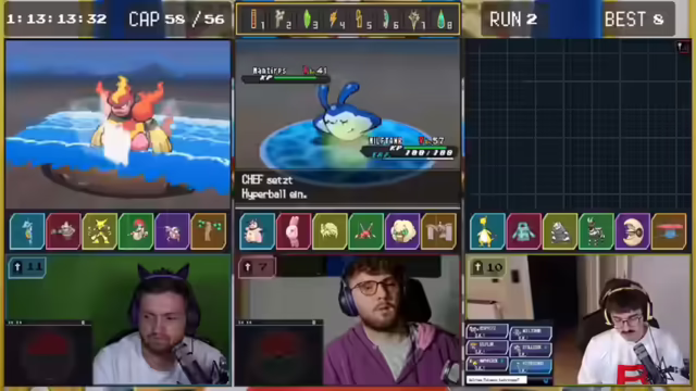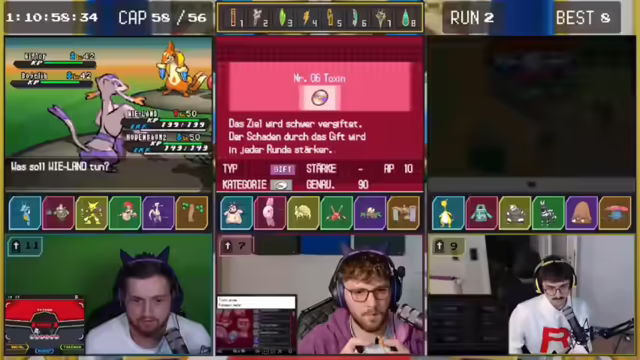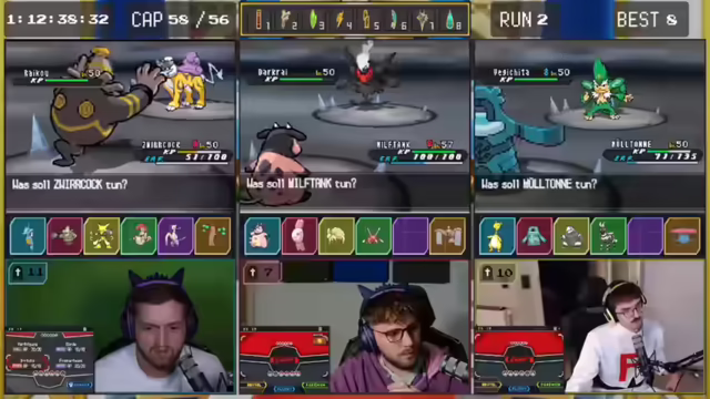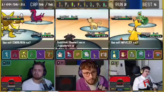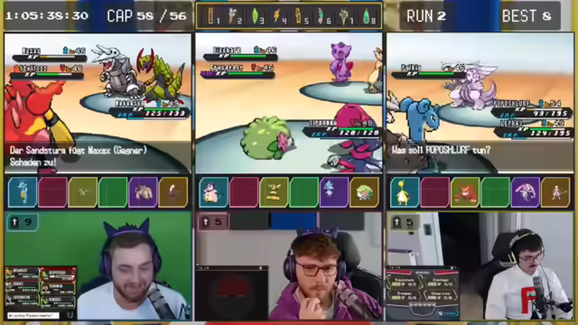 19:20:06Nachdem Giflor überlebt und das Knackrack besiegt wurde, steht ein Kampf gegen ein Tonupto bevor. Es wird erkannt, dass viele Pokémon im Team anfällig für Feuerattacken sind. Der Einsatz von Bronzong wird in Erwägung gezogen, trotz dessen Anfälligkeit gegenüber Feuer. Es stellt sich die Frage, ob Bronzong schneller als Tonupto ist und welche Attacken eingesetzt werden sollen. Nach dem Verlust von Bronzong muss ein weiteres Pokémon geopfert werden, um Zebritz die Möglichkeit zu geben, Tonupto zu besiegen. Es wird diskutiert, ob Zebritz mit Voltwechsel Tonupto besiegen kann oder ob Ampharos eine Attacke tanken muss. Die Entscheidung fällt auf Bronzong als Opfer, um Zebritz ins Spiel zu bringen. Durch einen glücklichen Volltreffer kann Zebritz Tonupto besiegen, jedoch hat sich der Protagonist verklickt. Es wird überlegt, ob ein Item zur Heilung eingesetzt werden soll, was jedoch das Ende des Runs bedeuten würde, da keine Pokémon mehr vorhanden wären. Der Protagonist bereut den Fehler und hofft auf ein Comeback. Es wird die Frage aufgeworfen, was für eine TM als nächstes geholt werden soll.