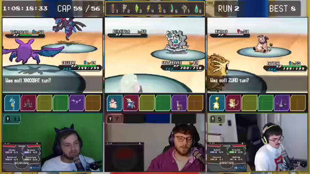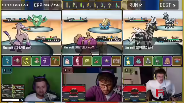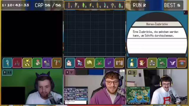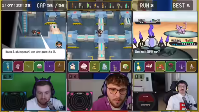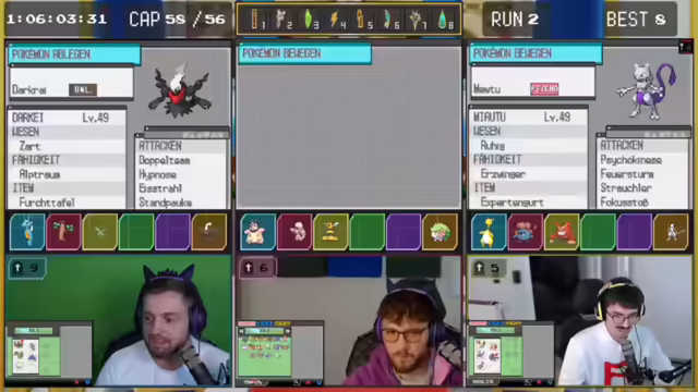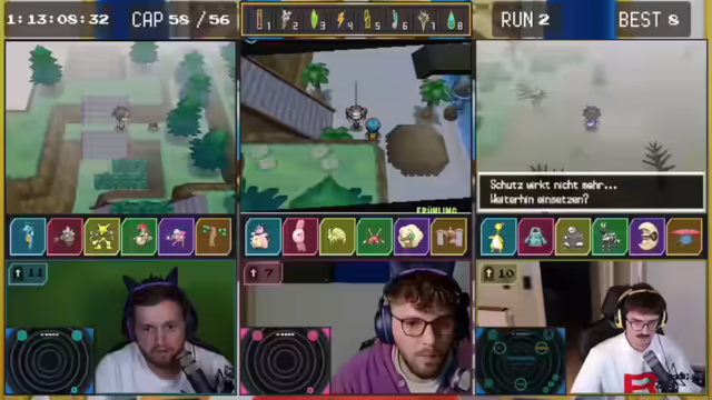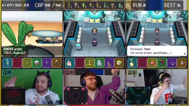 18:54:57Die Gruppe befindet sich in der Trio Soulink LAN Party und ist seit drei Tagen verzweifelt. Sie spielen seit 36 Stunden und sind in der Siegestraße angekommen. Wenn sie es nicht schaffen, müssen sie von vorne anfangen. Max will eine TM holen und opfert dafür ein Pokémon. Es wird überlegt, wem man Zerschneider beibringen soll. Der Streamer ist müde, will aber die Siegestraße schaffen, weil er ein Sieger ist. Er fragt, ob Zwirrklop ein spezieller oder physischer Angreifer ist. Die Pizza stinkt immer noch nach Oliven. Es wird über die Drawn Together Folge gesprochen, in der jemand keine Pizza mit Wurst bestellt hat. Es wird erwähnt, dass dies der beste Run ist, aber sie sind verzweifelt. Es wird überlegt, wer eine VM-Bitch mitnehmen soll, um Kaskade einzusetzen.
