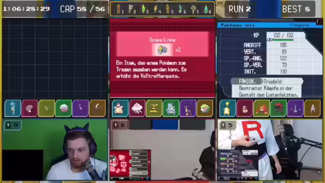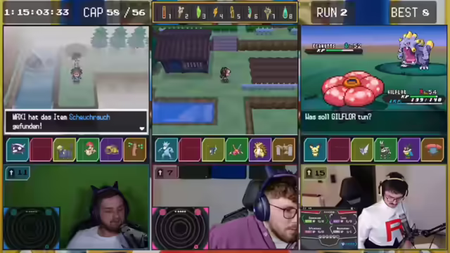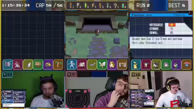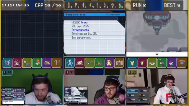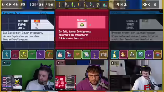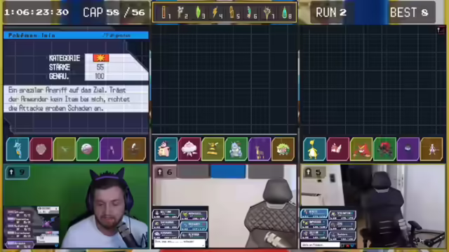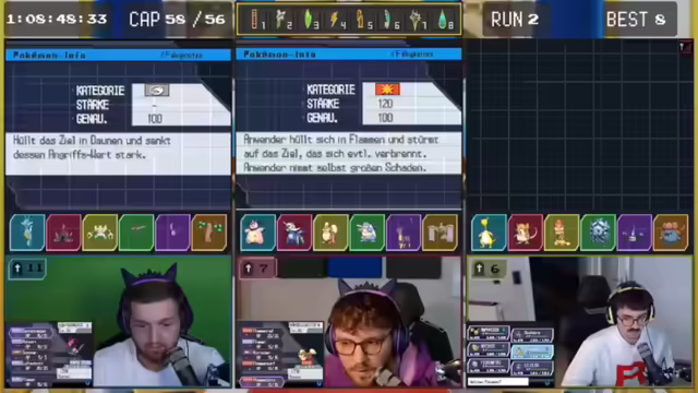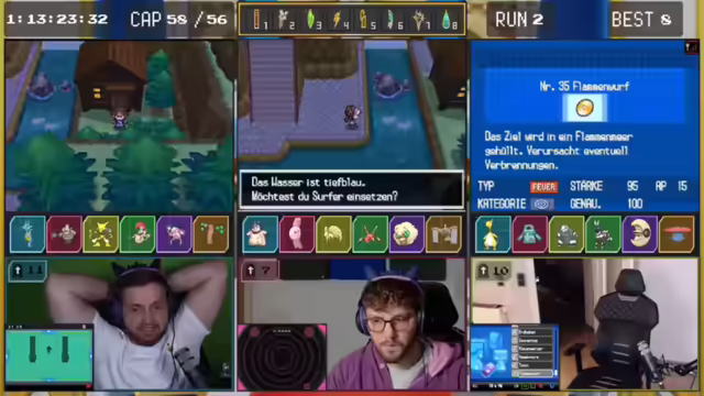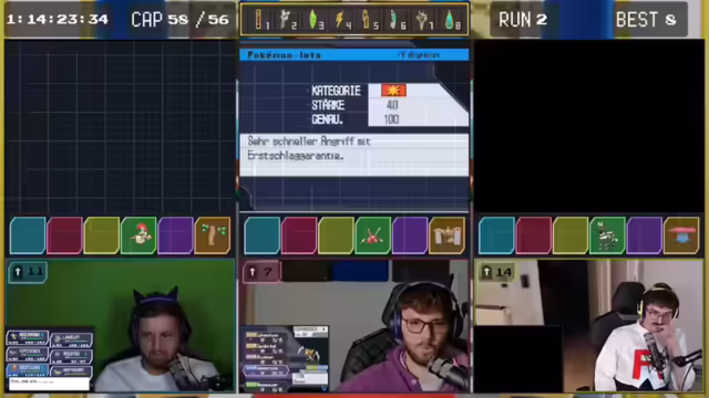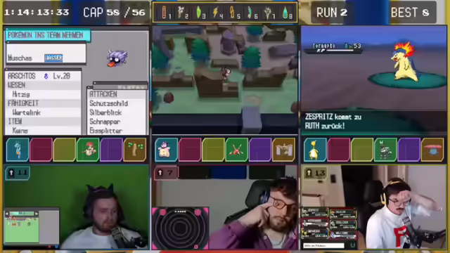 13:14:34Es wird überlegt, ob Bumadam eine Bodenattacke hat. Es wird Psychokinese eingesetzt. Es wird festgestellt, dass es Glück war, dass Bumadam keine Bodenattacke hatte. Es wird überlegt, was passiert wäre, wenn Bumadam Erdbeben oder Dampenwalze eingesetzt hätte. Es wird der lange Weg zurück thematisiert. Es wird nach der Fähigkeit von Radikal geschaut. Es hat Angsthase. Es wird festgestellt, dass Vostelka Käfer Stahl ist. Es wird überlegt, ob der Gegner sich gleich in die Luft jagt. Es wird festgestellt, dass das Team nicht geheilt wurde. Es wird kurz aufs Klo gegangen. Es wird über die Fähigkeit Angsthase von Radikal diskutiert. Es wird über die lange Zeit gesprochen, die auf dem Stuhl gezockt wird. Es wird erwähnt, dass nebenan das FIFA-Release ist. Es wird sich für den Support bedankt, dass trotz FIFA so viele Leute zuschauen. Es wird überlegt, wo es lang geht und zum Teleporter gegangen. Es wird sich überlegt, in die Story reinzugehen. Es wird der Chat aufgefordert, jaulen in den Chat zu schreiben.