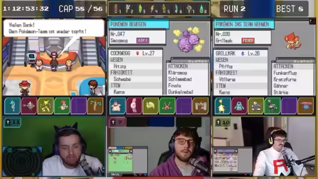 19:27:07Die Teamzusammensetzung wird als problematisch erkannt, da die Grabbox voll ist und eine zweite geöffnet werden muss. Es wird überlegt, welche Links mitgenommen werden sollen, wobei VMs (Versteckte Maschinen) ein Problem darstellen, da sie wertvolle Plätze belegen. Es wird diskutiert, ob Surfer als Tackle-Attacke verwendet werden kann. Es wird beschlossen, konstruktiv vorzugehen und die Schuld für die Fehler einzugestehen. Die Wasser-Pokémon werden als schwach eingestuft, und es wird überlegt, welche Links gefüllt werden sollen. Austoss, Entoron und Raichu sollen auf jeden Fall mitgenommen werden. Es wird festgestellt, dass Romatra ein schwaches Team hat, während der Protagonist und Chef noch gute Pokémon haben. Es wird überlegt, ob der Sandamer-Link noch angemeldet werden soll. Octillery, Kabutops und Cesurio werden als gute Optionen angesehen, jedoch gibt es Bedenken bezüglich der Anzahl der Wasser-Pokémon. Es wird erwähnt, dass ein Karadonis gefangen wurde, aber nicht in der Liste erscheint. Es wird entschieden, den Powder Guy für Romatra mitzunehmen und sich auf das Fangen von Pokémon für Kaskade zu konzentrieren. Es wird diskutiert, welche Level die Pokémon haben sollen, wobei 51 als fairer Wert angesehen wird.
