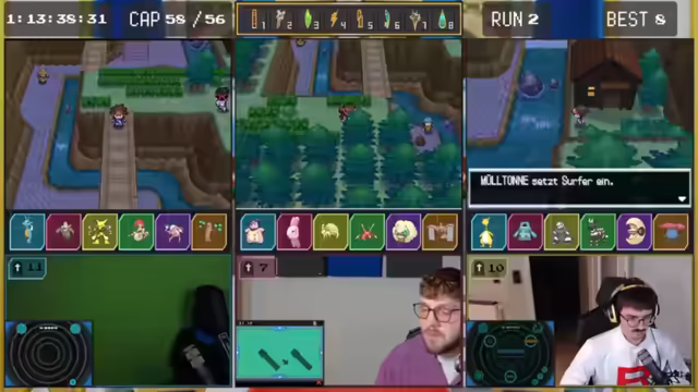 18:22:50Es wird ein Leben-Orb gefunden, aber dessen Nutzen wird infrage gestellt. Der Fund eines Kampfjuwels in einem 'Ding' wird als Schatz bezeichnet, der sich gelohnt hat. Die Frage, ob sich das Reinfahen in diese Dinger rentiert, wird aufgeworfen, um bessere Encounter zu erzielen. Es wird festgestellt, dass niemand surfen kann. Es wird überlegt, ob ein weiteres Wasser-Pokémon benötigt wird, aber die Kraft dafür fehlt. Durch einen Verklicker gerät man in einen Trainer-Kampf. Die Level der gegnerischen Pokémon werden als hoch empfunden. Es wird die Regel diskutiert, dass man sein letztes Lead-Pokémon hochleveln darf, wenn es tot ist. Martra erhält den Auftrag, ins Wasser zu surfen. Ein neuer Encounter wird erwähnt, und es wird nach einem Taubsee gefragt.