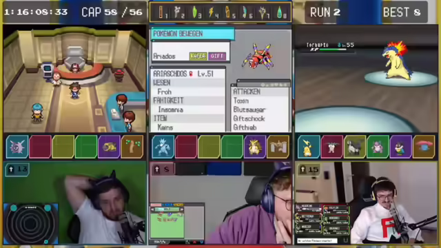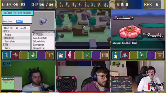 20:08:28Die Situation eskaliert, als ein unerwarteter Schnappobor auftaucht, der das Team zu vernichten droht. Panik bricht aus, da der Schnappobor scheinbar jede Strategie kontert. Es wird fieberhaft überlegt, welche Pokémon noch eine Chance gegen ihn haben könnten, doch die Optionen scheinen begrenzt. Die Erkenntnis, dass Stahl- und Boden-Pokémon eine besonders gefährliche Kombination darstellen, verschärft die Situation zusätzlich. Es wird diskutiert, ob man auf riskante Manöver setzen soll, wie den Einsatz von Toxin, in der Hoffnung, den Schnappobor langsam zu besiegen, bevor er das gesamte Team auslöschen kann. Die Stimmung ist angespannt, da der Ausgang des Kampfes ungewiss ist und viel von Glück und präzisen Entscheidungen abhängt. Es wird überlegt, ob man Plauderguy opfern soll, um Zeit zu gewinnen oder den Gegner zu schwächen. Letztendlich wird entschieden, auf eine riskante Strategie zu setzen, in der Hoffnung, dass Giflo überlebt und den Schnappobor mit Mega-Sauger besiegen kann. Die Entscheidung ist riskant, da viel von dem Ausgang dieses einen Kampfes abhängt. Es wird überlegt, ob man mit Giflortoxin den Gegner schwächen und dann auswechseln soll, aber die Stahl-Eigenschaft des Gegners macht dies unmöglich.