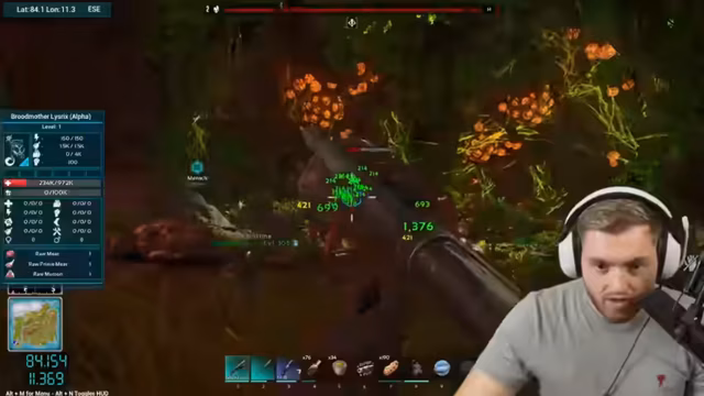 05:15:38Der Kampf gegen die Brutmutter beginnt chaotisch und endet mit einer Niederlage. Obwohl die Gruppe mit voller Munition und den Dinos startet, wird sie schnell von der Boss-Gegnerin und den zusätzlich erscheinenden Spinnen überwältigt. Die Megatheriums fallen schnell, der Yutyrannus geht verloren und die Schrotflintenmunition reicht nicht aus, um den Boss rechtzeitig zu besiegen. Trotz eines fast erfolgreichen Angriffs, bei dem die Brutmutter auf niedrige Lebenspunkte gebracht wird, scheitern sie am Druck und an der fehlenden Vorbereitung. Die Konsequenz ist ein Full Reset: alle Ressourcen, Dinos und Ausrüstung sind verloren, und das Team muss das Spiel von Grund auf neu aufbauen.