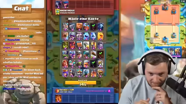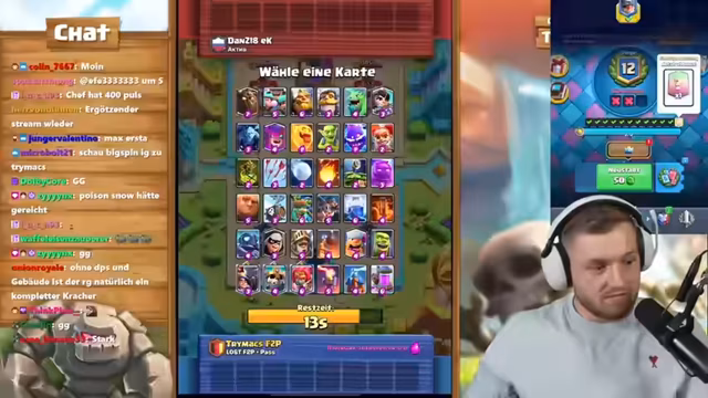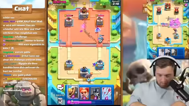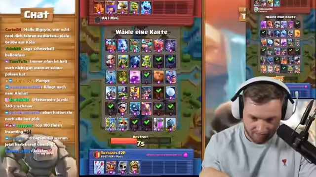 Bei der Herausforderung im Spiel Clash Royale versuchten die drei Spieler, die Vorgabe von je zwölf Siegen zu erreichen. Dabei wurden verschiedene Kartendecks und Spielstrategien diskutiert. Besonders intensiv war der Vergleich der Spielstile. Der Fokus lag auf der Teamdynamik zwischen Trymacs und Chef gegen Bigspin. Trotz starker Gegner und komplexer Spielzüge wurde die Motivation bis zum Ende aufrechterhalten.