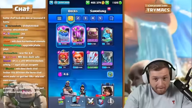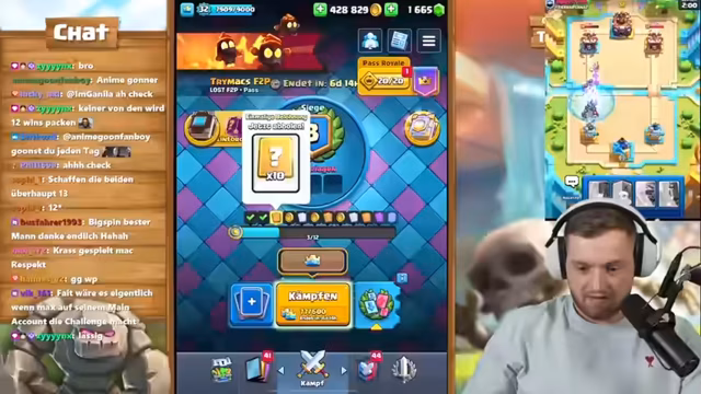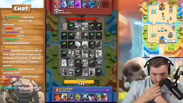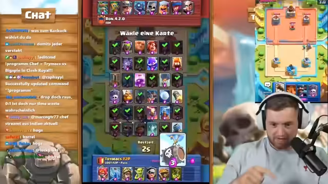 00:48:44Der Streamer startet eine Clash Royale-Challenge gegen Chef Strobel und Big Spin. Die Challenge besteht darin, wer zuerst dreimal die zwölf Siege in Megadraft schafft und die Legendary-Sammelkarte holt. Während des Streams gibt es einige technische Probleme und Verwirrung über den Modus. Der Streamer ermutigt Chef Strobel, der Top 1000 in Deutschland ist, schnell zu gewinnen. Das Match-up gegen Big Spin beginnt, und der Streamer kommentiert das Spielverhalten.