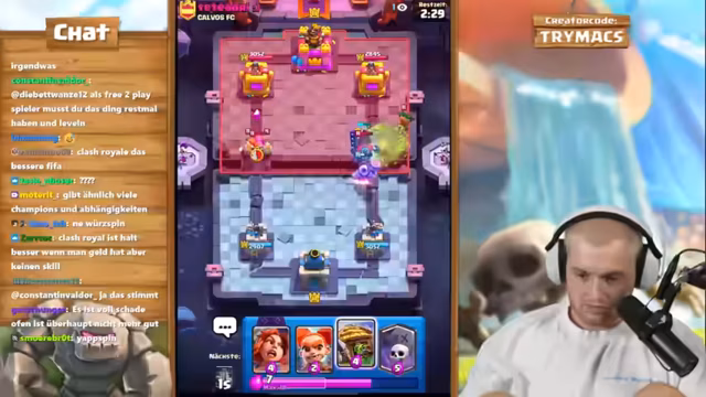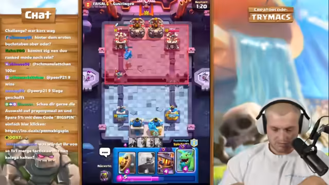 05:24:07Der Stream startet mit einem 2 gegen 2 Clash Royale Modus. Das Ziel ist, so viele Siege wie möglich in Folge zu erzielen, da jeder Sieg einem Sub-Gift entspricht. Die Streamer agieren als Team und kommunizieren über Strategien, Kartenzyklen und geplante Züge, um gemeinsam gegnerische Paarungen zu besiegen. Es wird eine konstante Nutzung von Karten wie Baby-Drachen, Golem und Maschinen demonstriert, um den Druck auf die Gegner aufrechtzuerhalten.