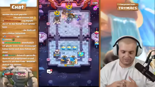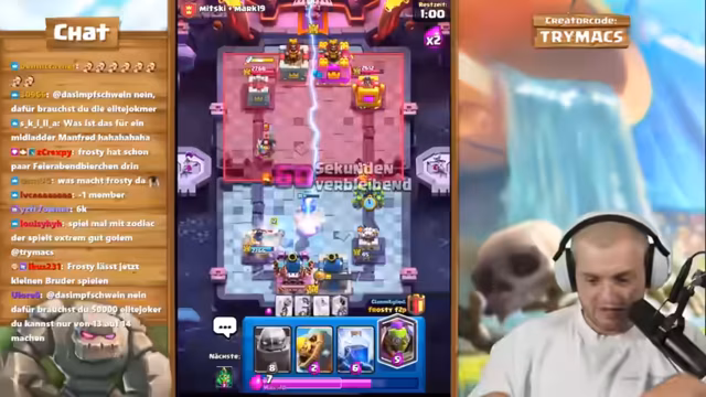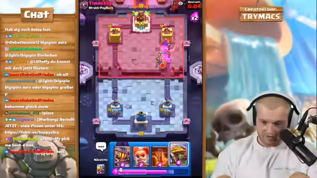 05:21:52Das Duo-Kampf-Format geht weiter, und die Streak steigt auf neun Siege an. Gegen ein Spam-Deck mit Doppelheilern passen die Spieler ihre Strategie an. Der Streamer gibt strategische Anweisungen, um das Spiel zu kontrollieren, und gibt zu, dass dies ein 'scheiß Job' ist. Der Fokus liegt darauf, mit den richtigen Kartenzyklen wie Baby Dragon und Maschine den Druck aufrechtzuerhalten, während die Gegner unterschiedliche Spielstile zeigen.