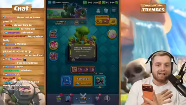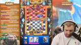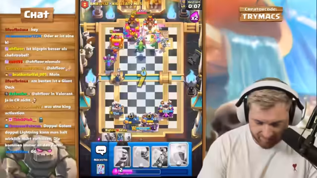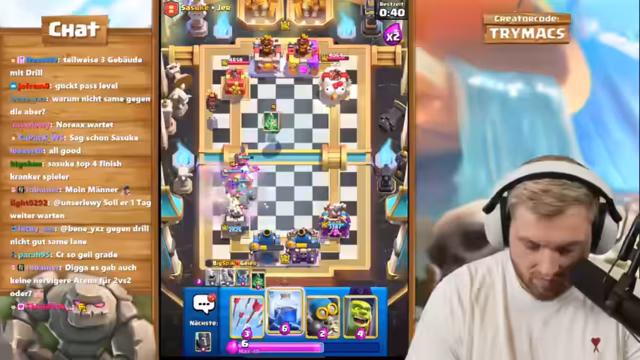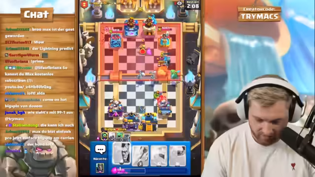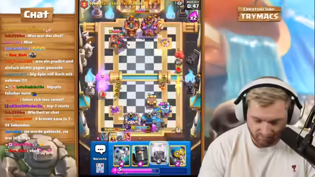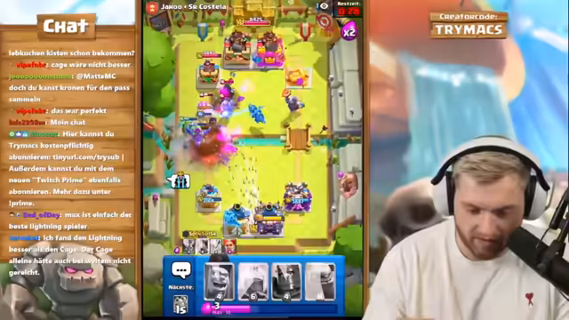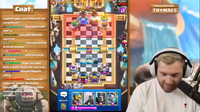 01:55:43Nach dem Clash of Clans-Segment wechselt der Streamer zu Clash Royale. Die Veranstaltung ist ein hochrangiges 2vs2-Ranked-Spiel mit seinem Partner BigSpin, der global Platz 26 belegt. Der Streamer ist auf einem Free-to-Play-Account unterwegs und erklärt, dass die Belohnungen für die Top-Platzierungen schwierig zu erreichen sind. Das Paar plant, ein neues Golem-Control-Deck zu testen und sucht nach einer Strategie, um gegen die weltbesten 2vs2-Teams bestehen zu können.