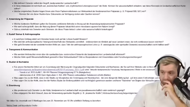 00:53:03Nach dem ausführlichen Segment über den Bergunfall wechselt der Stream zum nächsten angekündigten Thema, der Reaktion auf ein Video von TwoBoardGuys über das Bio-Siegel 'Demeter'. Er gibt zu, dass er den Namen noch nie gehört hat, und es beginnt eine Aufklärung über die strengeren Richtlinien dieses Siegels, die weit über normale EU-Bio-Standards hinausgehen. Der Streamer ist zunächst beeindruckt von den Bemühungen um Tierwohl und Umweltschutz, wird aber zunehmend skeptisch, als er auf die esoterischen Grundlagen des Demeter-Ansatzes stößt.