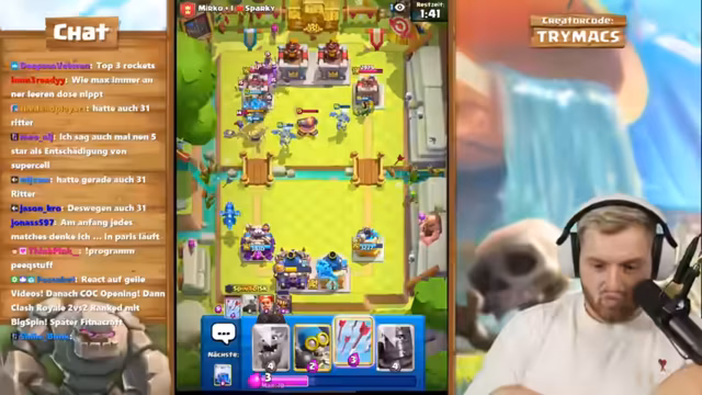 00:00:58Zu Beginn des Streams gibt der Kanal trymacs einen detaillierten Einblick in den geplanten Ablauf. Um 18 Uhr steht ein 2vs2 Ranked Spiel im Clash Royale mit BigSpin auf dem Programm. Vorher sollen zwei React-Segmente stattfinden: eines für das neueste Video von Jules und eines von Demeter. Der Streamer erwähnt auch weitere Videos von Hugo und Dave, die auf der Agenda stehen. Er plant, mit den Reacts zu starten und danach die anderen Inhalte zu behandeln. Zusätzliche geplante Aktivitäten erwähnt er, als er anspielt, dass er mit FitnaCraft viel Minecraft spielen wird.
