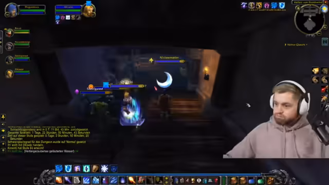 03:30:34Bevor der Dungeon beginnt, gibt es Probleme bei der Besetzung. Ein geplanter Spieler ist nicht erschienen und es mangelt an einem Tank. Nachdem der initiale Tank aufgeben muss, wird Niki, der Druide, als neuer Tank verpflichtet. Es werden alle schnell informiert und eine neue Gruppe mit Kroko als Ersatz zusammengestellt. Es wird beschlossen, den aggressiven Spielstil beizubehalten und die Mobs effektiv zu pullen.