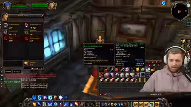 03:16:50Die Vorbereitung für einen anstehenden Dungeon wird gezeigt. Der Streamer craftet mehrere Seidentaschen für seine Mitspieler und zeigt, wie man Gegenstände über den Gildenchat weitergeben kann. Zusätzlich wird eine Diskussion über die Ausrüstung geführt, insbesondere über den Abwäg zwischen mehr Schaden oder mehr Ausdauer für den Schurken, was von der Spielweise abhängt.